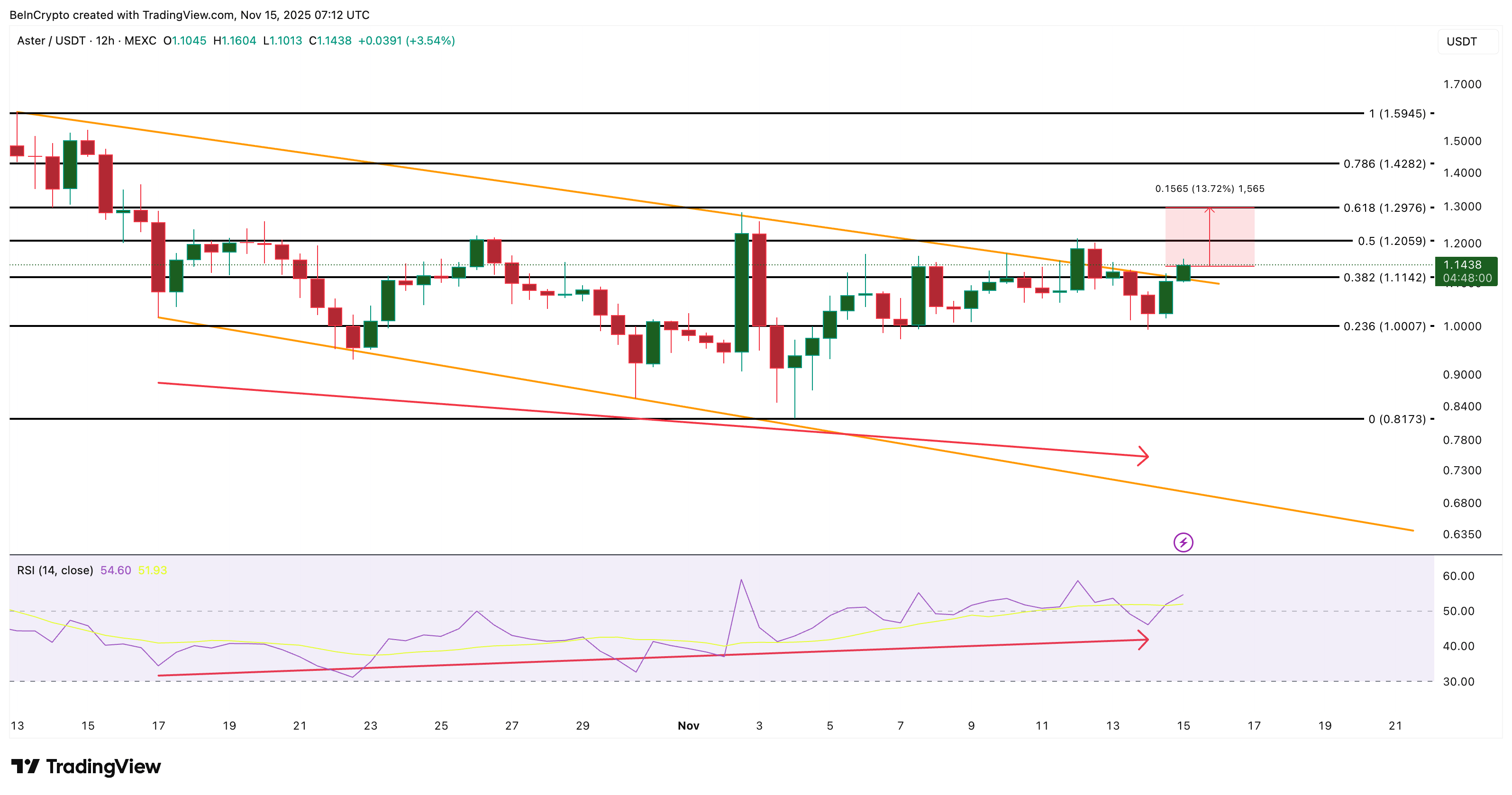 چارت قیمتی نیز رفتار این گروهها را تأیید میکند. قیمت ASTER در تایمفریم ۱۲ ساعته از یک کانال نزولی خارج شده است که فرسایش روند نزولی را نشان میدهد. علاوه بر این، میان ۱۷ اکتبر تا ۱۴ نوامبر (۲۵ مهر تا ۲۳ آبان)، قیمت کف پایینتری زده اما RSI کف بالاتری ثبت کرده، نشانهای از واگرایی مثبت که معمولاً نشاندهنده تغییر مسیر شتاب و احتمال آغاز حرکت صعودی است.