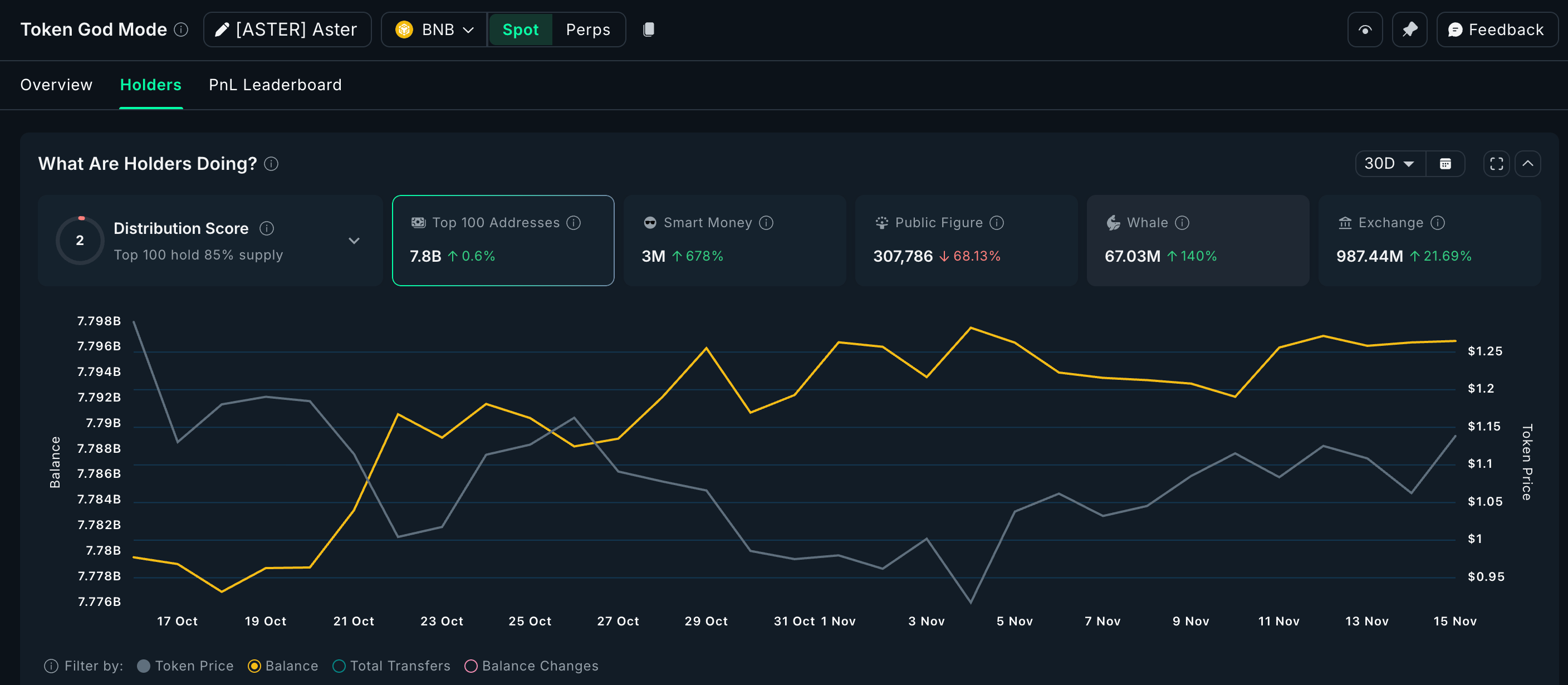 دومین دارایی مورد توجه نهنگها آستر (Aster) است که سرعت انباشت آن بسیار بالاتر از آپتیمیزم بوده است. کیف پولهای بزرگ طی ۳۰ روز گذشته میزان دارایی خود را ۱۴۰٪ افزایش داده و مجموع دارایی خود را به بیش از ۶۷.۰۳ میلیون توکن رساندهاند.