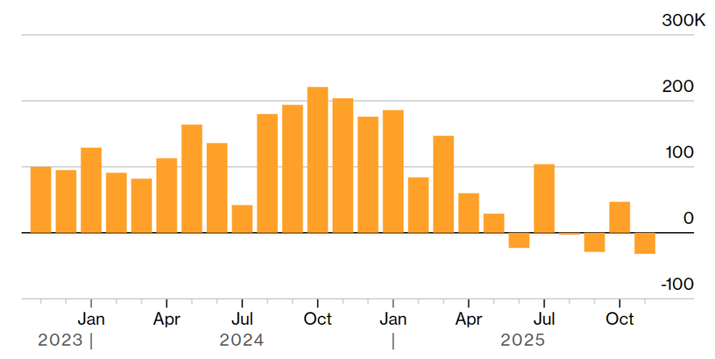 بازار کار آمریکا در ماه نوامبر نشانه‌هایی از ضعف بروز داد؛ شرکت‌های خصوصی ۳۲,۰۰۰ شغل حذف کردند و فشار بر کسب‌وکارهای کوچک افزایش یافت. طبق گزارش ADP، دستمزد کارکنان نیز نسبت به اکتبر ۰.۱٪ کاهش یافته که نگرانی‌های تورمی را کمتر کرده است.