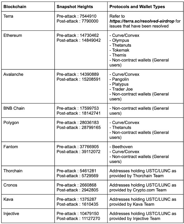 بر اساس این پروپوزال، اسامی شبکهها، پروتکلها و نوع کیف پولهای واجد شرایط ایردراپ لونا و زمان اسنپ شات هرکدام در جدول زیر آمده است: