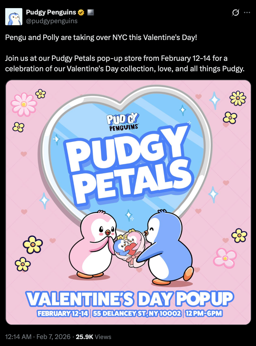برند کریپتویی پاجی پنگوئنز (Pudgy Penguins) با یک رویداد حضوری ویژه روز ولنتاین وارد نیویورک شده است؛ این رویداد سه‌روزه نشان می‌دهد این پروژه چگونه از یک پدیده اینترنتی و NFT، به یک برند فرهنگی و مصرفی در دنیای واقعی تبدیل شده است.