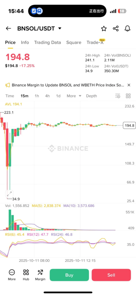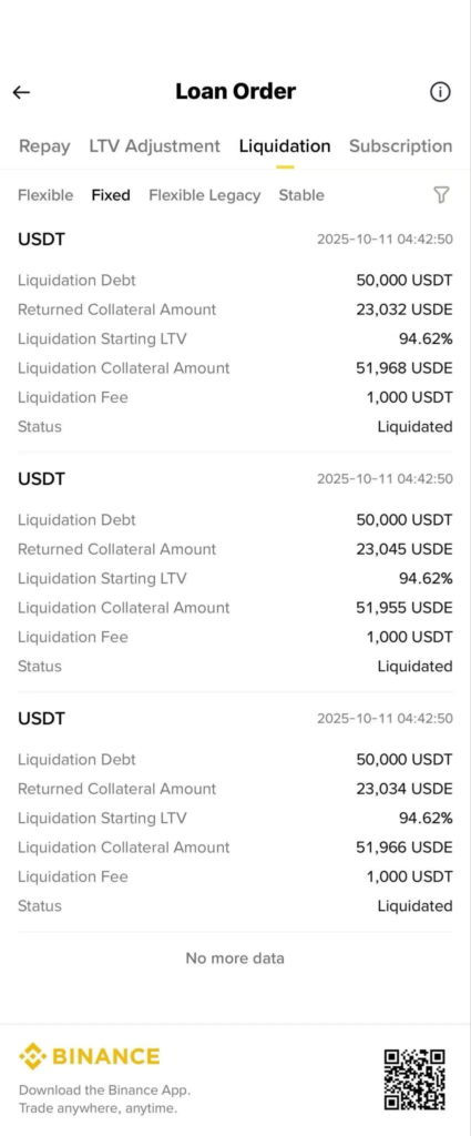 همزمان با سقوط شدید بیتکوین و آلتکوینها، کاهش قیمت کوینها همراه با از دست دادن شدید پِگ (Depegging) داراییهای وثیقهای، ارزش مارجین را بیش از پیش کاهش داد. قیمت USDE تا ۰.۶۵ دلار، wBETH تا ۰.۲۰ دلار و BnSOL تا ۰.۱۳ دلار سقوط کرد. حتی پرتفویهای پوشش ریسک شده (Hedged) نیز نتوانستند در برابر این فروپاشی مارجین مقاومت کنند و این امر موجب فعال شدن لیکوئیدیشنهای زنجیرهای شد. فراتر از لیکوئیدیشنهای مرتبط با مارجین، USDE تحت تأثیر برنامه سود ۱۲٪ بایننس نیز قرار گرفت که آسیب ناشی از این حمله هدفمند را تشدید کرد.