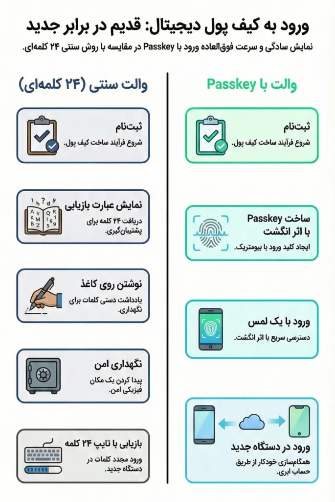 دنیای کیف پولهای غیرامانی در حال گذار از عصر «کاغذ و ۲۴ کلمه» به عصر «اثر انگشت و پسکی» است. در مدل قدیمی، امنیت به ظرافت نگهداری عبارت بازیابی گره خورده بود و در مدل جدید، امنیت بر ترکیب کلیدهای رمزنگاری و احراز هویت بیومتریک سوار شده است. هیچکدام جادویی و بدون ریسک نیستند؛ فقط نوع ریسک عوض و کمتر شده است. در کیف پول ۲۴ یا ۱۲ کلمهای باید هنر مخفیکردن و بکآپ گرفتن داشته باشید، در کیف پول پسکی باید حواستان باشد این «اعتبارنامه نامرئی» را بیدلیل پاک نکنید! اگر بخواهیم همه این بحث را در یک جمله خلاصه کنیم، شاید این باشد: