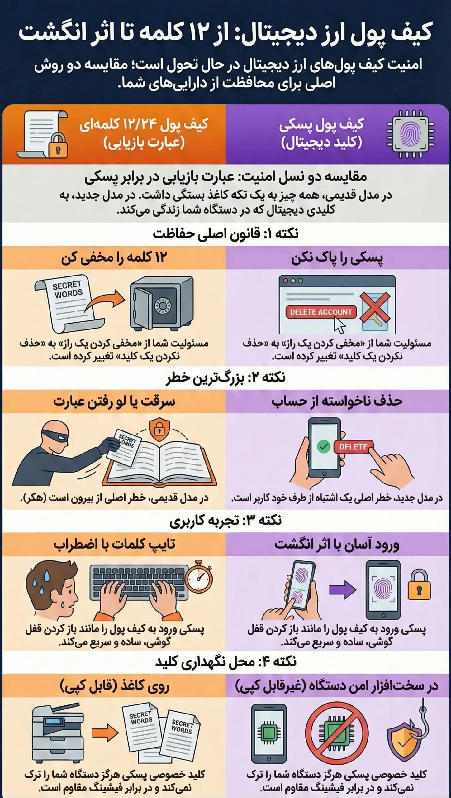 دنیای کیف پولهای غیرامانی در حال گذار از عصر «کاغذ و ۲۴ کلمه» به عصر «اثر انگشت و پسکی» است. در مدل قدیمی، امنیت به ظرافت نگهداری عبارت بازیابی گره خورده بود و در مدل جدید، امنیت بر ترکیب کلیدهای رمزنگاری و احراز هویت بیومتریک سوار شده است. هیچکدام جادویی و بدون ریسک نیستند؛ فقط نوع ریسک عوض و کمتر شده است. در کیف پول ۲۴ یا ۱۲ کلمهای باید هنر مخفیکردن و بکآپ گرفتن داشته باشید، در کیف پول پسکی باید حواستان باشد این «اعتبارنامه نامرئی» را بیدلیل پاک نکنید! اگر بخواهیم همه این بحث را در یک جمله خلاصه کنیم، شاید این باشد: