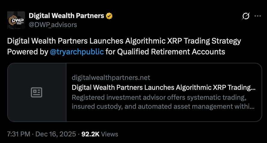 از سوی دیگر، شرکت دیجیتال ولث پارتنرز (Digital Wealth Partners) بهتازگی یک استراتژی معاملاتی الگوریتمی مبتنی بر XRP را برای حسابهای بازنشستگی واجد شرایط راهاندازی کرده است.