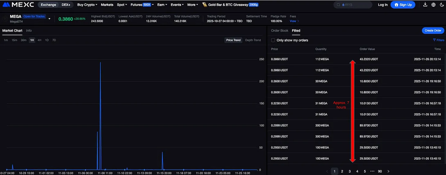 هایپرلیکوئید و بایبیت روی هم صدها میلیون دلار حجم معاملات برای MegaETH داشتهاند. هایپرلیکوئید به تنهایی در روزهای اوج به ۳۵ میلیون دلار و بایبیت به نزدیک ۸ میلیون دلار رسید. این را با بازار پیش از عرضه به سبک OTC در صرافی MEXC مقایسه کنید که حجمهای کوچکتر و دفتر سفارشی خشکیده با جهشهای گاهبهگاه دارد.