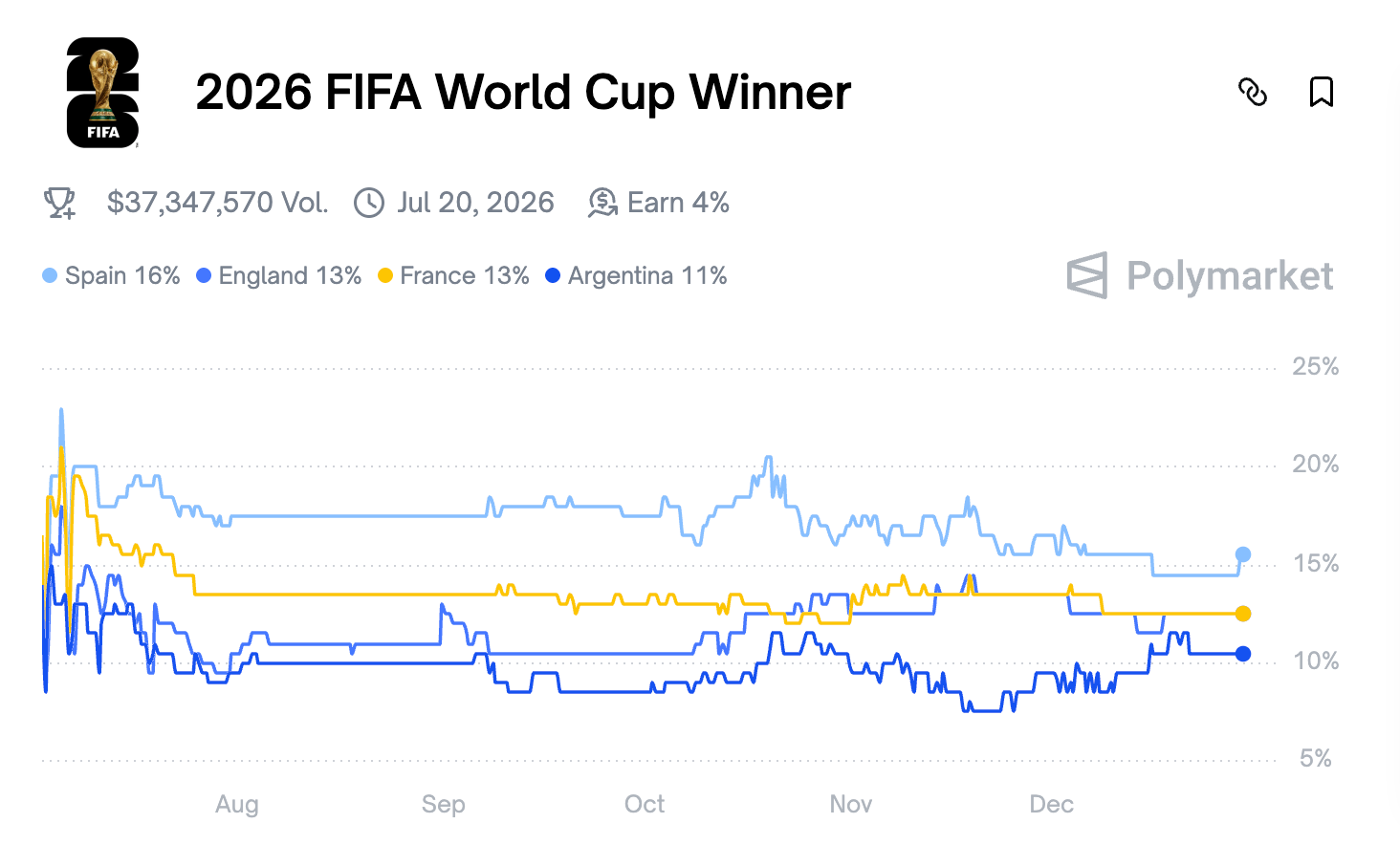 بر اساس داده‌های Polymarket، اسپانیا در حال حاضر با احتمال ۱۶٪، بخت نخست قهرمانی محسوب می‌شود و پس از آن، انگلیس، فرانسه و آرژانتین در فاصله‌ای نزدیک قرار دارند.