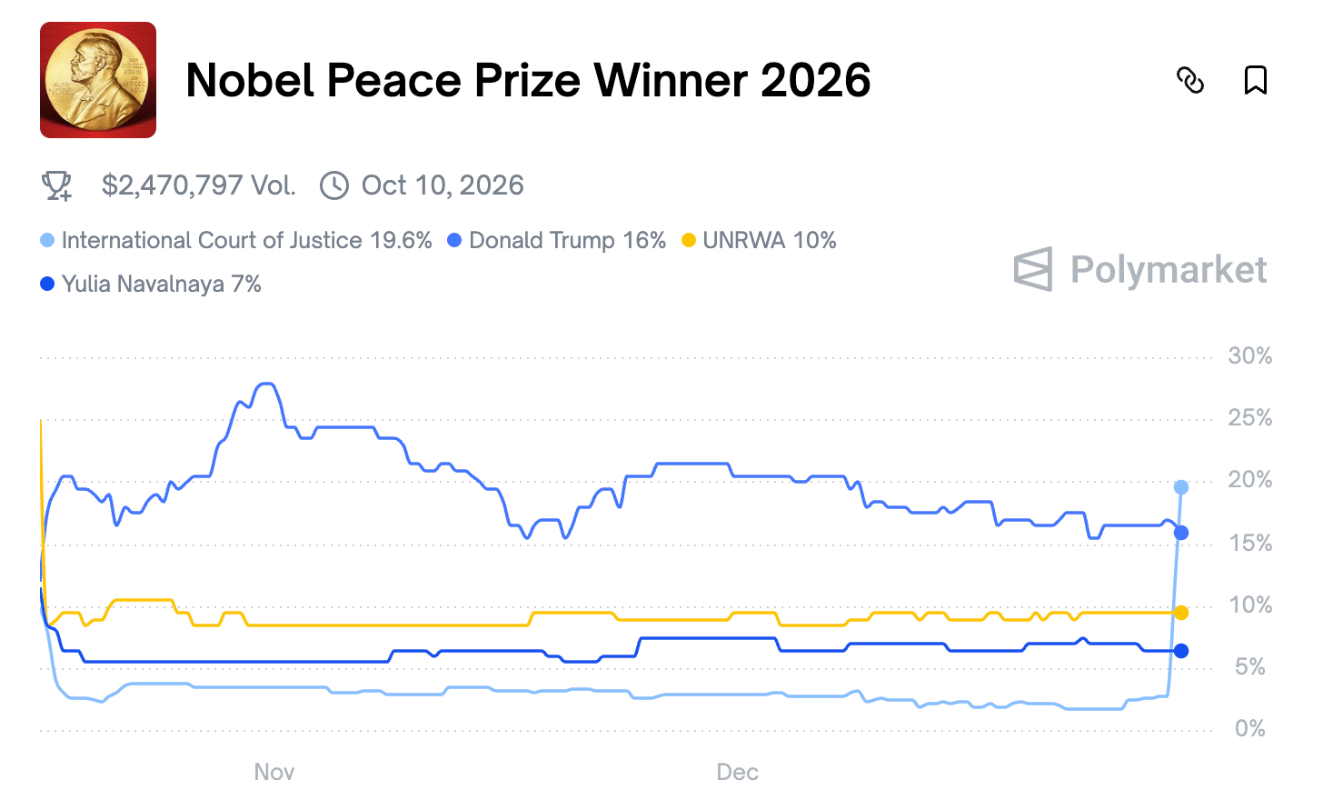 پیش‌بینی برنده جایزه صلح نوبل ۲۰۲۶ - منبع: Polymarket