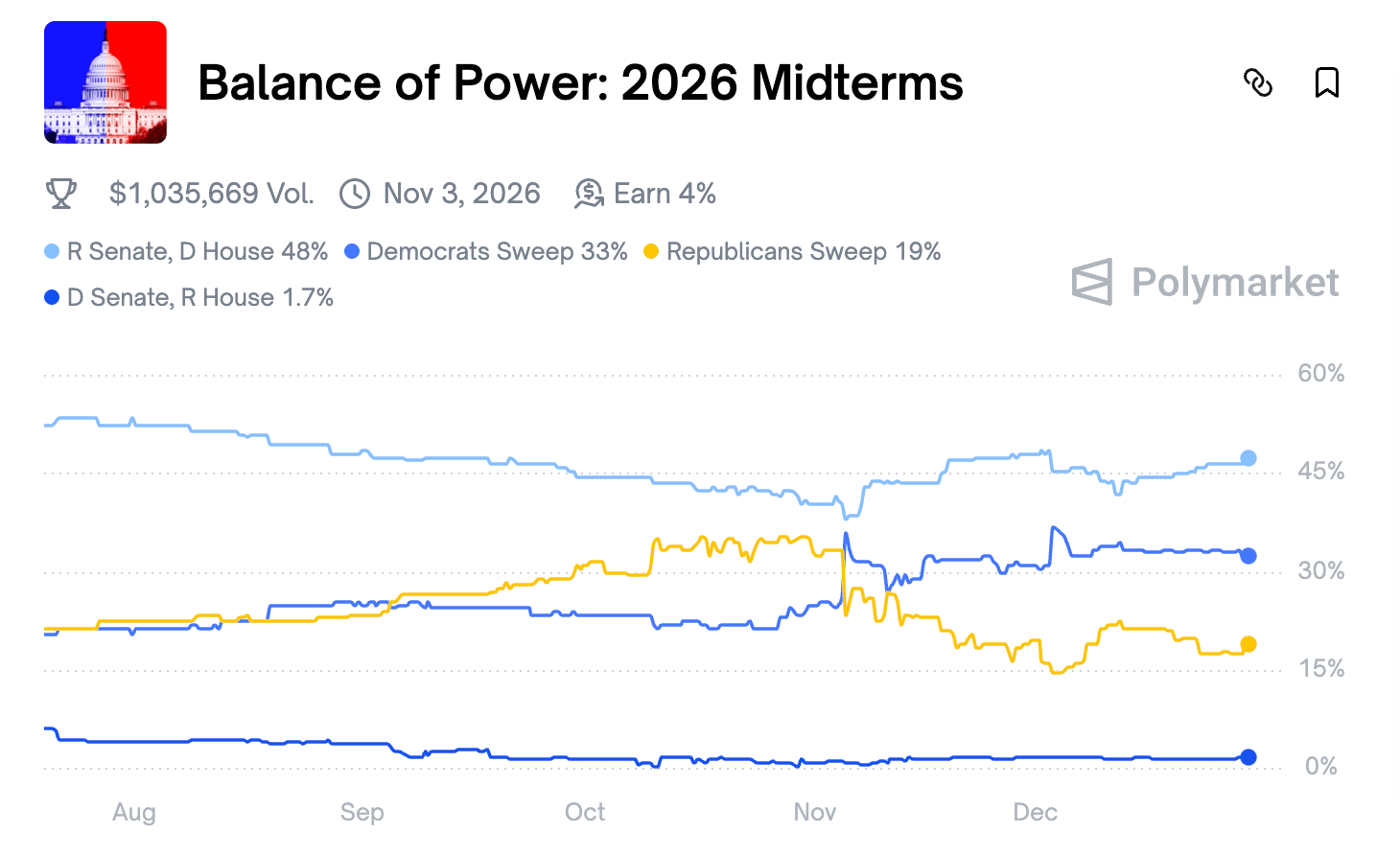 پیش‌بینی توازن قدرت در آمریکا پس از انتخابات ۲۰۲۶ - منبع: Polymarket