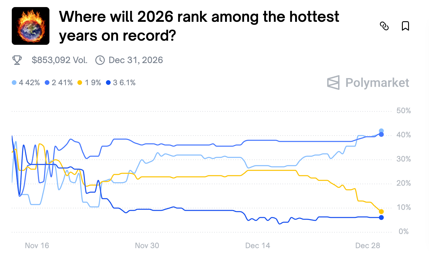 افزایش مداوم دمای زمین، سال ۲۰۲۶ را به یکی دیگر از سال‌های حساس از نظر اقلیمی تبدیل کرده است. بر اساس شاخص دمای خشکی و اقیانوسی ناسا، معامله‌گران Polymarket، به‌میزان ۳۸٪ احتمال می‌دهند که ۲۰۲۶ چهارمین سال گرم ثبت‌شده در تاریخ باشد و احتمال ثبت رکورد جدید نیز ۹٪ برآورد شده است.