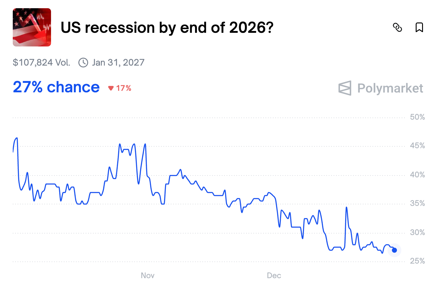 با وجود عبور اقتصاد آمریکا از چند سال پرتنش، نگرانی درباره رکود همچنان پابرجاست. با این حال، بازارهای پیش‌بینی فعلاً نگاه خوش‌بینانه‌‌ای دارند و احتمال وقوع رکود اقتصادی در سال ۲۰۲۶ را تنها معادل ۲۷٪ می‌دانند.