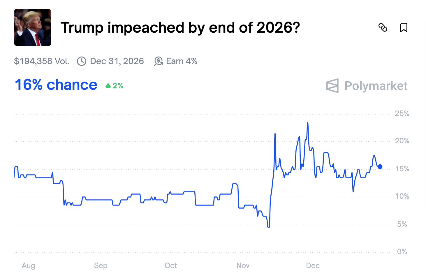 با این حال، بازارهای پیش‌بینی احتمال استیضاح او تا پایان سال ۲۰۲۶ را تنها ۱۶٪ برآورد می‌کنند؛ با توجه به زمان‌بندی اثرگذاری انتخابات میان‌دوره‌ای، این عدد چندان دور از انتظار نیست.