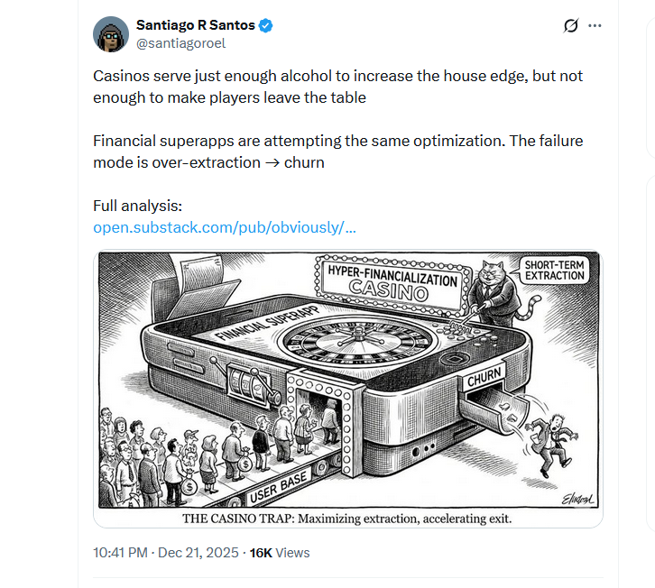 سانتیاگو روئل سانتوس (Santiago Roel Santos)، بنیان‌گذار و مدیرعامل شرکت سرمایه‌گذاری اینورژن کپیتال (Inversion Capital)، معتقد است موج تازه‌ای که پلتفرم‌های مالی و فین‌تک‌ها را به سمت افزودن بازارهای پیش‌بینی سوق داده در کوتاه‌مدت جذاب به نظر می‌رسد، اما در بلندمدت می‌تواند هزینه سنگینی به شکل افزایش ریزش کاربران برای آن‌ها داشته باشد.