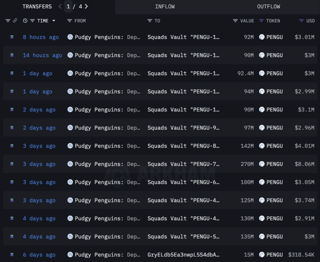این توکنها از تاریخ ۱۱ جولای (۲۰ تیر) تا امروز، از طریق چند آدرس متعلق به Squads Vault، به مقصد صرافیها فرستاده شدهاند. با وجود این انتقالها، این کیف پول، همچنان مالک ۹.۵۴۱ میلیارد توکن PENGU است، که حدود ۲۹۹ میلیون دلار ارزش دارد.