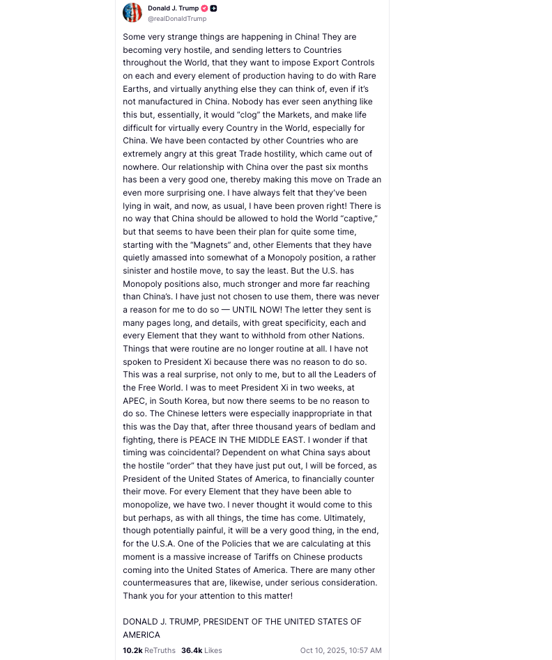 چند ساعت بعد، ترامپ با انتشار پستی دیگر اعلام کرد که قصد دارد از اول نوامبر ۲۰۲۵ (یا حتی زودتر) تعرفه ۱۰۰٪ بر تمام کالاهای وارداتی از چین اعمال کند. همین دو پیام کافی بود تا شوک عظیمی به بازارهای جهانی وارد شود و قیمت دارایی‌های ریسکی، از سهام تا رمزارزها، با سقوط شدید مواجه گردد.