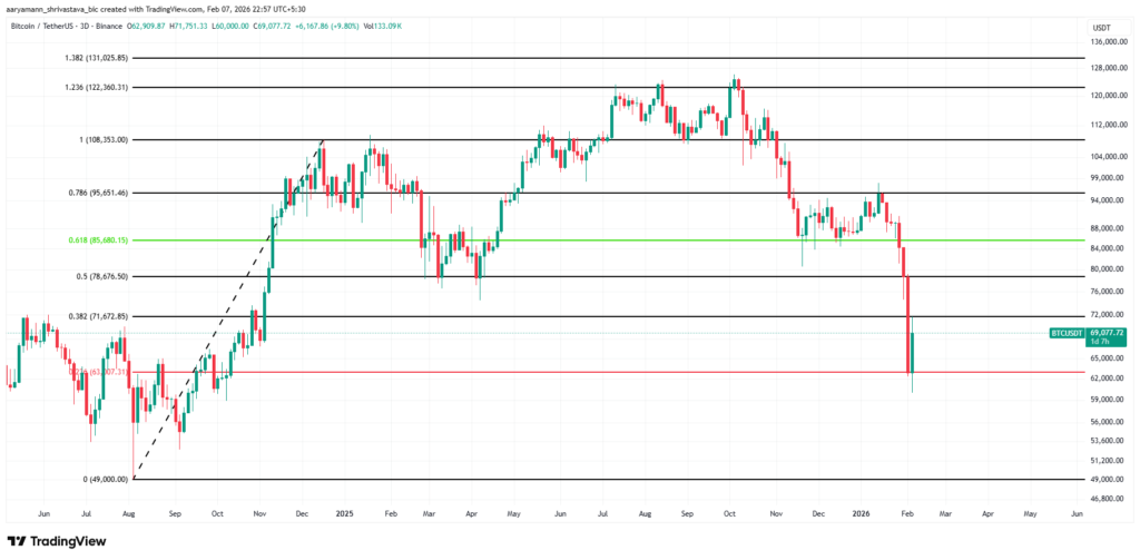 در حال حاضر بیت کوین پس از بازگشت از حمایت ۶۳,۰۰۰ دلار، نزدیک محدوده ۶۹,۰۰۰ دلار معامله میشود. دفاع خریداران از این سطح نشاندهنده وجود تقاضای قوی در قیمتهای پایینتر است، اما خطر افت بیشتر همچنان پابرجاست. اگر حمایت ۶۳,۰۰۰ دلار از دست برود، احتمال ادامه روند نزولی تقویت شده و هدف بعدی میتواند محدوده تاریخی ۵۵٬۵۰۰ دلار باشد.