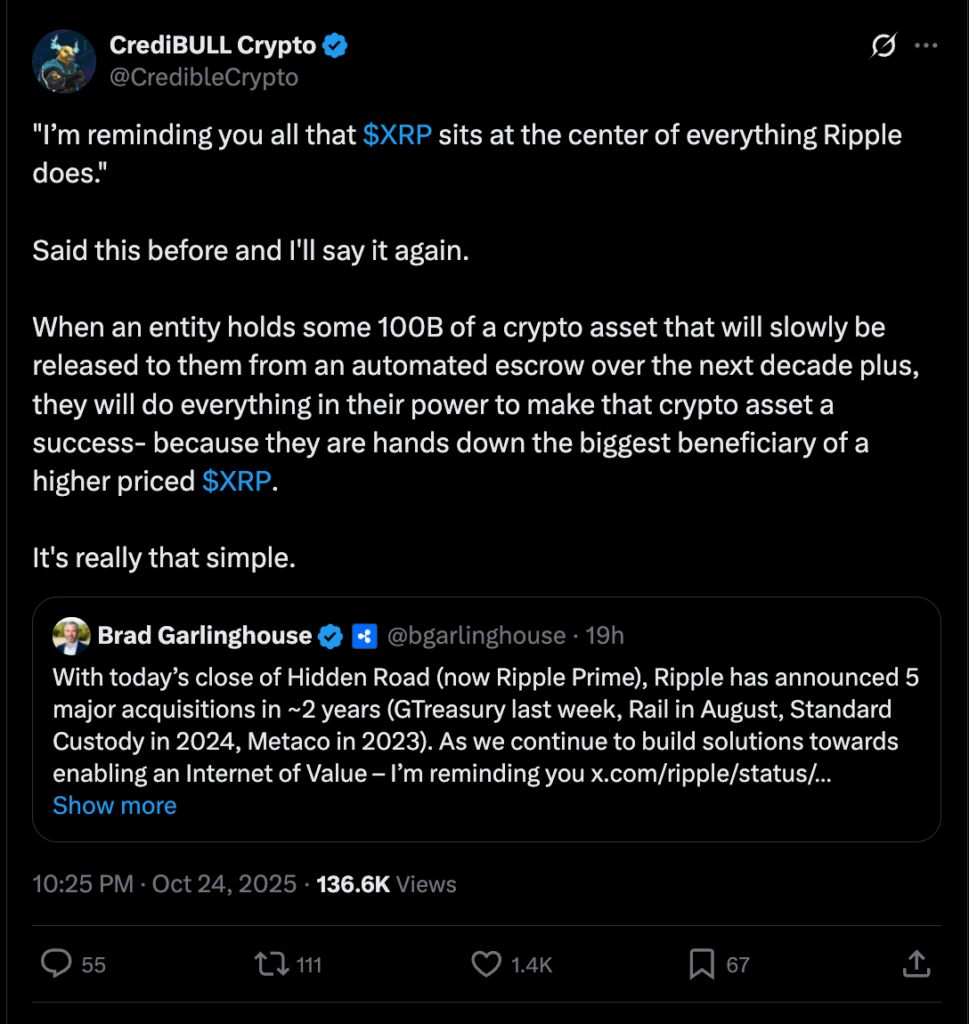 عامل دیگری که دیدگاه صعودی نسبت به ریپل را تقویت کرده، گسترش استراتژی نهادی این شرکت است. ریپل بهتازگی خرید پلتفرم هیدن رود (Hidden Road) را نهایی کرده و نام آن را به ریپل پرایم (Ripple Prime) تغییر داده است. این اقدام ریپل را به نخستین شرکت رمزارزی تبدیل میکند که بهصورت جهانی و چنددارایی در قالب یک کارگزار اصلی (Prime Broker) فعالیت میکند. در بیانیه رسمی شرکت آمده است: