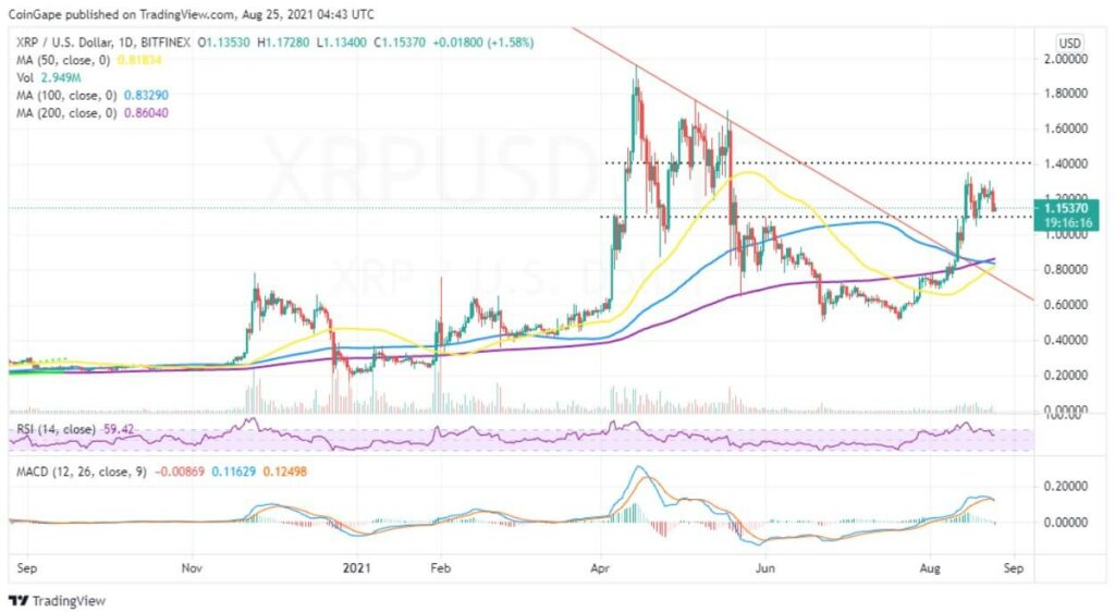 سرمایهگذاران امیدوار بودند قیمت رمز ارز XRP بالاتر از ۱.۴ دلار بسته شود و بتواند تا ۱.۶ دلار صعود کند. با این حال باید در حال حاضر با فشار فروش دست و پنجه نرم کنند.