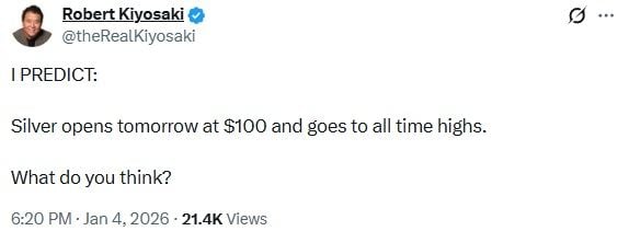 به گزارش میهن بلاکچین، کیوساکی در تاریخ ۴ ژانویه ۲۰۲۶ (۱۴ دی) در شبکه اجتماعی ایکس (X) اعلام کرد که انتظار دارد قیمت نقره از فردا در سطح ۱۰۰ دلار در هر اونس باز شود و سپس به سمت ثبت سقفهای تاریخی جدید حرکت کند؛ این پیشبینی واکنشهای گستردهای در میان فعالان بازار داراییهای سخت به همراه داشته است.