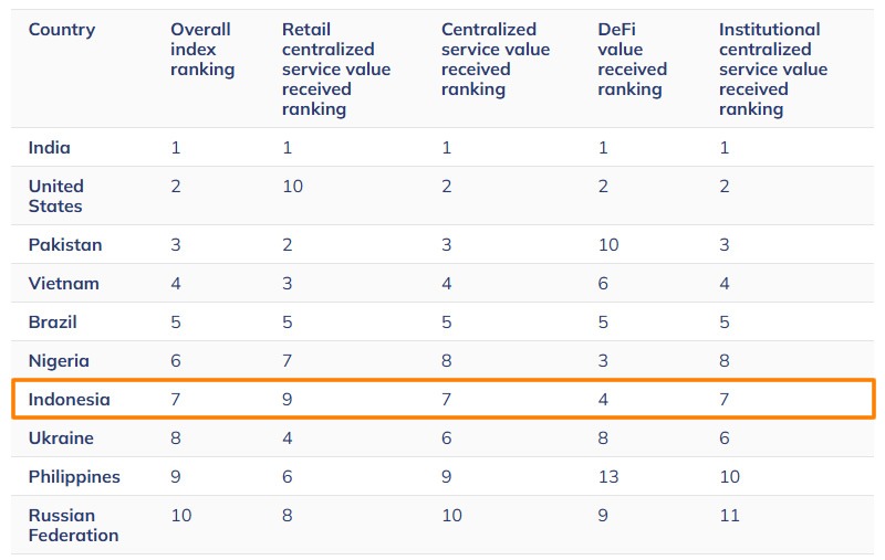 طبق گزارش چینالیسیس (Chainalysis)، اندونزی در گزارش شاخص پذیرش رمزارز سال ۲۰۲۵ در رتبه هفتم جهان قرار گرفته و عنوان «بزرگترین بازار کریپتوی جنوبشرقی آسیا» را نیز به خود اختصاص داده است.