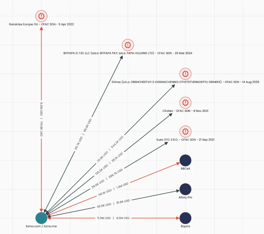 صرافی اکسمو (Exmo) ادعا کرده بود که پس از حمله روسیه به اوکراین در سال ۲۰۲۲، بازار روسیه را ترک کرده و فعالیت محلی خود را به Exmo.me واگذار کرده است. اما تحلیلهای آنچین الیپتیک خلاف این ادعا را نشان میدهد؛ زیرا هر دو پلتفرم همچنان از زیرساخت کیف پول مشترک استفاده میکنند و تمامی واریزها در هاتولتهای یکسان تجمیع میشود.