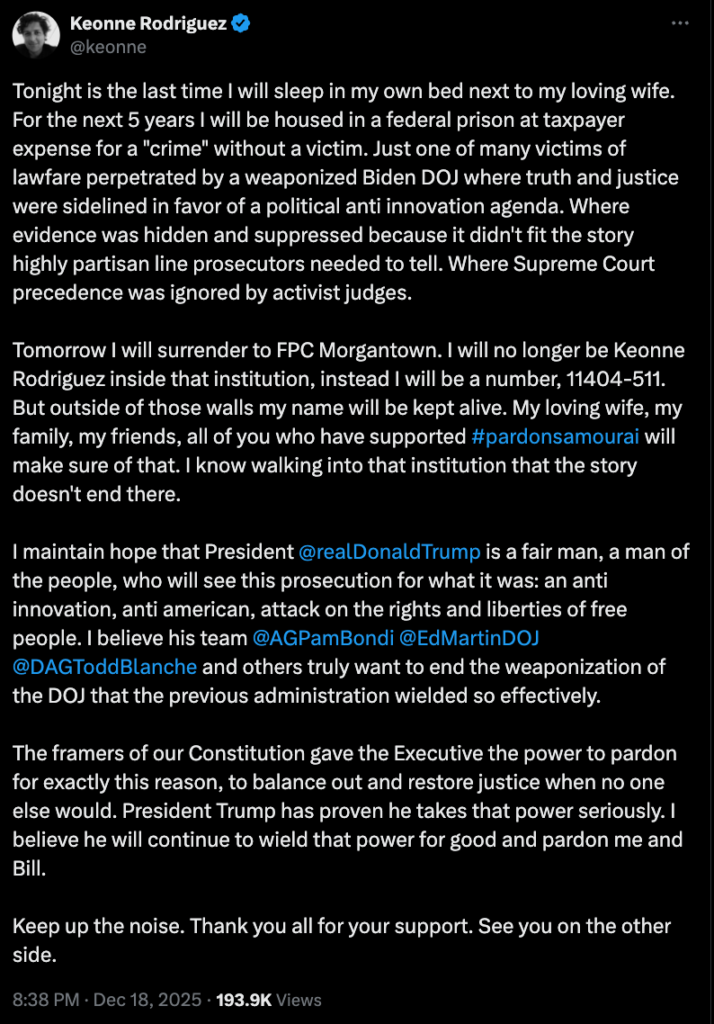 کئون رودریگز (Keonne Rodriguez)، همبنیانگذار سامورایی ولت (Samourai Wallet)، در آستانه آغاز دوران محکومیت خود، با انتشار پیامی در شبکههای اجتماعی از دونالد ترامپ خواست او را مورد عفو قرار دهد.