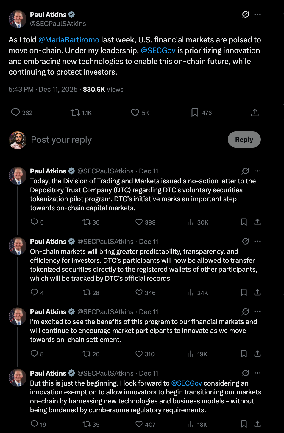 نهاد ناظر SEC این راهنما را یک روز پس از آن منتشر کرد که «پل اتکینز» (Paul Atkins)، رئیس SEC، اعلام کرد نظام مالی سنتی در حال حرکت به سمت آنچین شدن (Onchain) است.