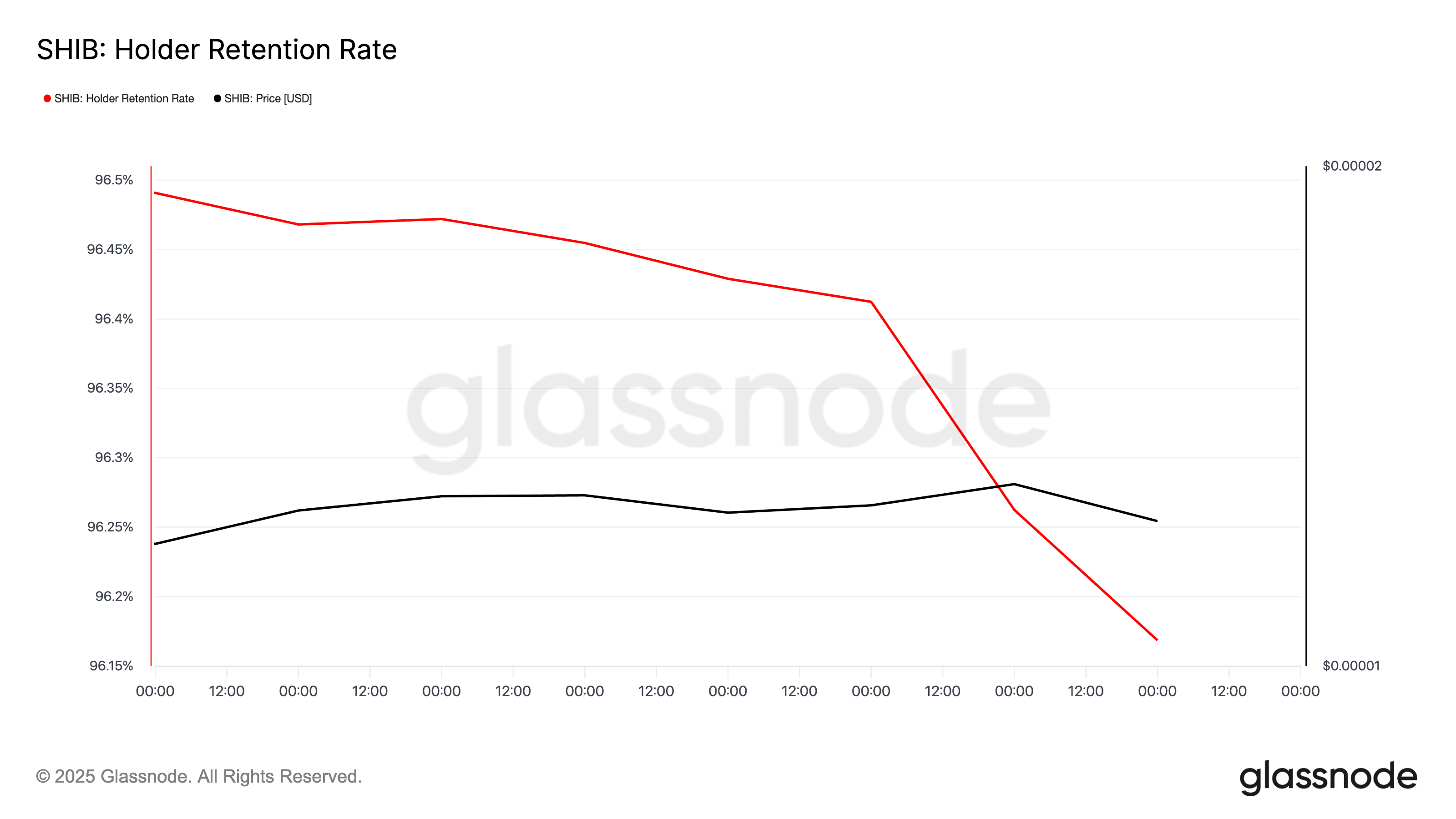 دادههای آنچین پلتفرم گلسنود (Glassnode) تصویر نگرانکنندهتری از وضعیت فعلی شیبا اینو ترسیم میکند. طبق آمار این شرکت، شاخص نرخ نگهداری هولدرها (Holder Retention Rate) در هفته اخیر روندی نزولی داشته و اکنون به پایینترین حد خود در ۵۳ روز گذشته یعنی ۹۶.۱۶٪ رسیده است.