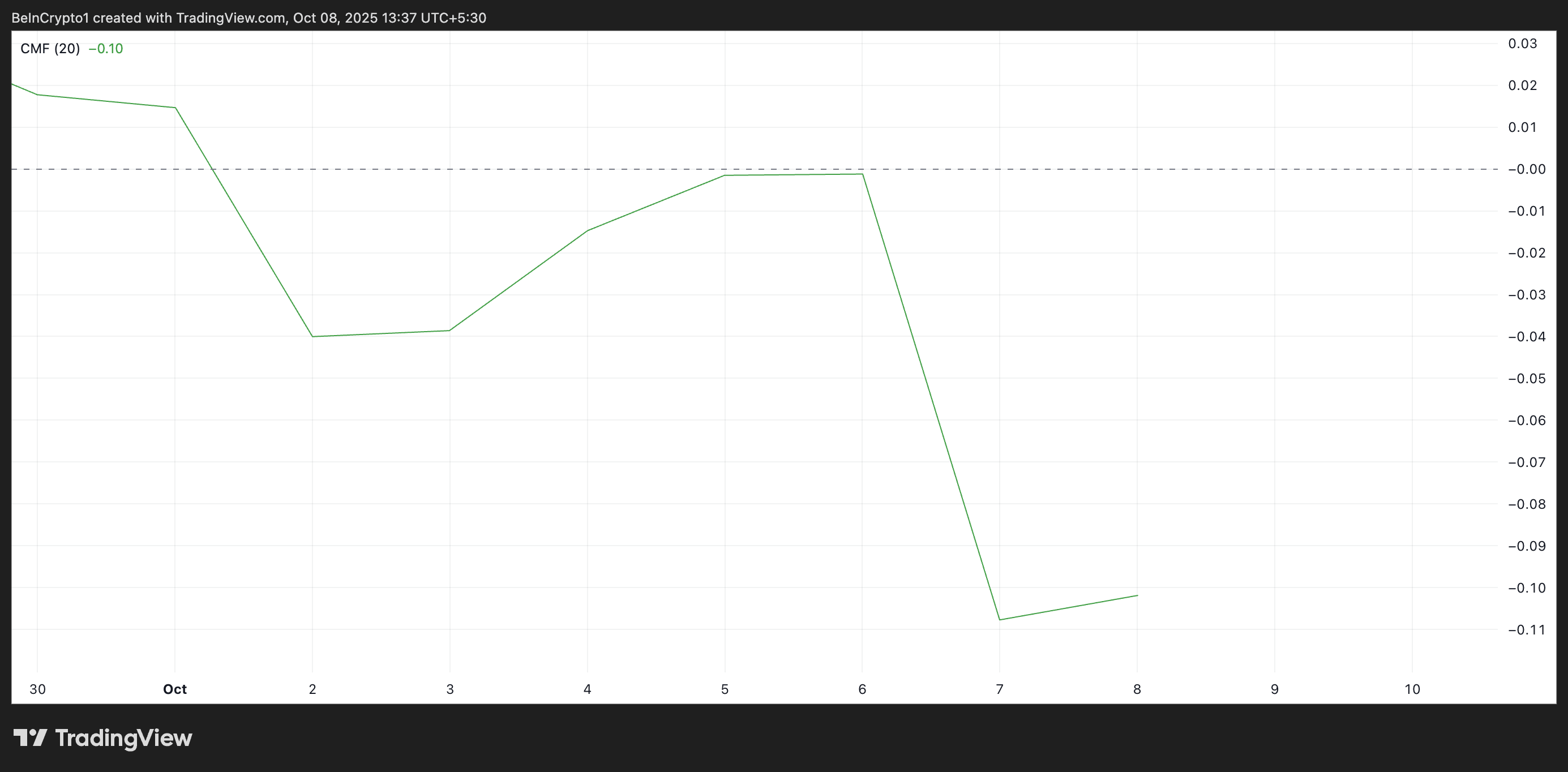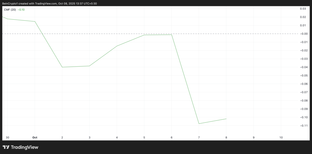 در نمودار روزانه شیبا اینو، شاخص جریان پول چایکین (Chaikin Money Flow) نیز زیر خط صفر قرار دارد که نشاندهنده خروج نقدینگی از بازار و افزایش فشار فروش است. در لحظه نگارش این گزارش، مقدار CMF برابر با ۰.۱۰- ثبت شده که سیگنالی هشداردهنده محسوب میشود.