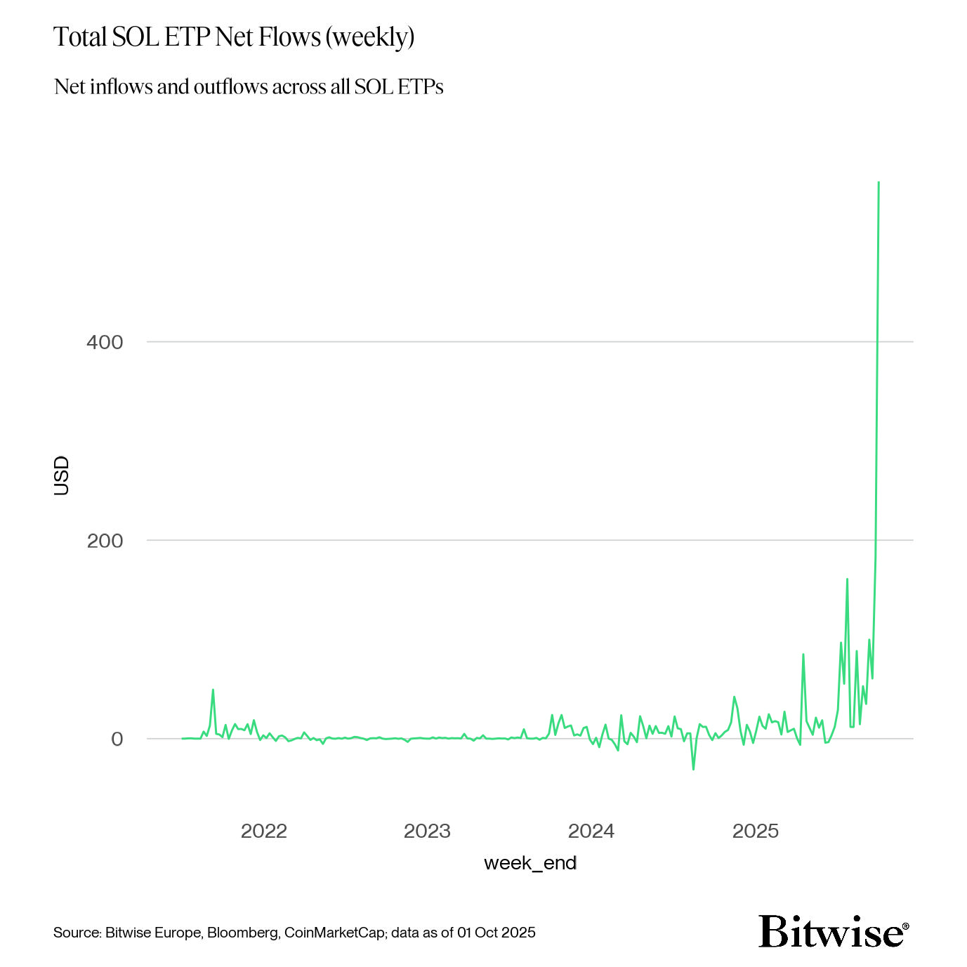 افزایش ورود سرمایه به محصولات مالی مرتبط با سولانا نیز گواه دیگری بر افزایش علاقه نهادهای مالی است. ارزش خالص داراییهای تحت مدیریت صندوقهای قابل معامله (ETP) سولانا از مرز ۵۰۰ میلیون دلار عبور کرده است.