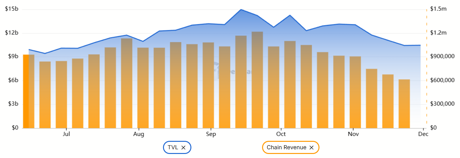 ارزش کل قفلشده (TVL) در شبکه سولانا روز دوشنبه به ۱۰.۵ میلیارد دلار رسید که نسبت به یک ماه قبل ۲۰٪ کاهش یافته است. درآمد شبکه، که بر اساس کارمزدهای هفتگی محاسبه میشود، به پایینترین سطح خود از ماه می رسیده است و همین موضوع عملکرد ضعیف SOL در مقایسه با آلت کوینهای بزرگ را توضیح میدهد. برای مقایسه، کارمزدهای هفتگی اتریوم در همین دوره تنها ۵٪ کاهش داشته است.