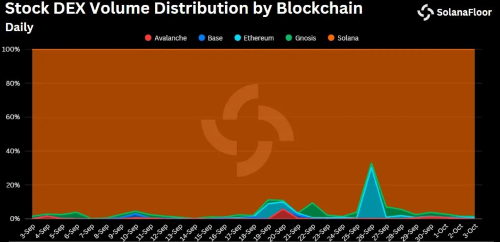 به گزارش میهن بلاکچین، داده‌های جدید پلتفرم سولانا فلور (Solana Floor) نشان می‌دهد این شبکه در ۳۰ روز گذشته توانسته ۹۵.۶٪ از کل حجم معاملات سهام توکنیزه‌شده را به خود اختصاص دهد؛ این رقم نشان از سلطه مطلق آن بر این بخش از بازار دارد.
