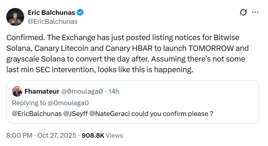 به گزارش میهن بلاکچین، سه صندوق ETF جدید مبتنی بر آلت کوینها، شامل صندوق سولانا از شرکت بیتوایز (Bitwise)، صندوقهای لایت کوین (Litecoin) و هدرا (Hedera) از شرکت کناری (Canary)، قرار است امروز عرضه شوند. تحلیلگران معتقدند تأیید ETF سولانا نقطه عطفی برای پذیرش سازمانی آلت کوینها خواهد بود و میتواند تا ۶ میلیارد دلار سرمایه جدید را تنها در سال نخست جذب کند.