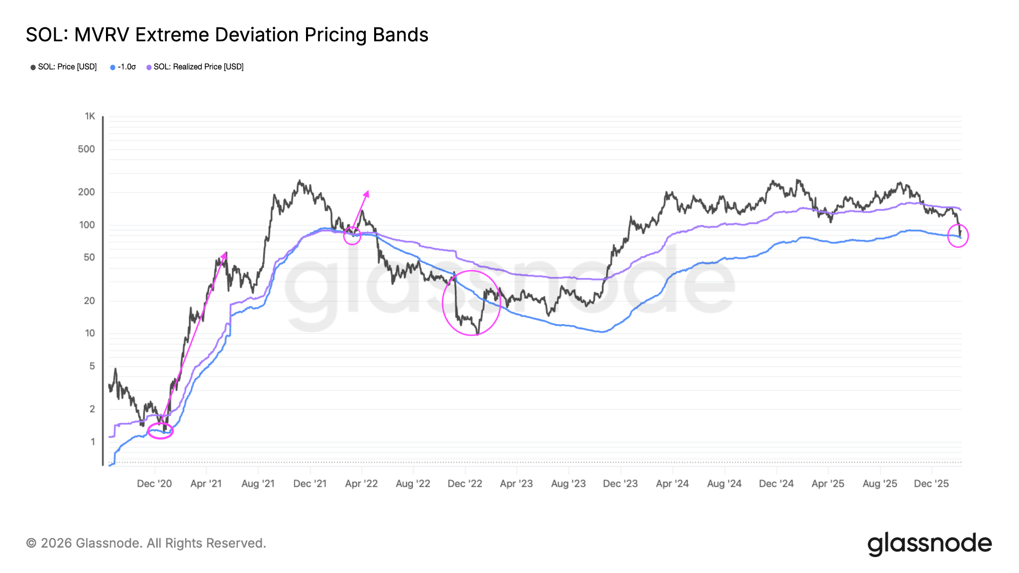 با این حال، تجربه سقوط بازار در نوامبر ۲۰۲۲ و ارتباط سولانا با ورشکستگی صرافی افتیایکس (FTX) نشان داد که این شاخص همیشه بهتنهایی قابل اتکا نیست. در آن دوره، قیمت سولانا بهطور قابلتوجهی پایینتر از باند پایینی MVRV سقوط کرد، حدود ۷۰٪ دیگر ریزش داشت و در نهایت در دسامبر همان سال حوالی ۷ دلار به کف رسید.