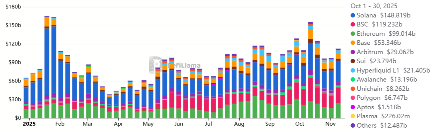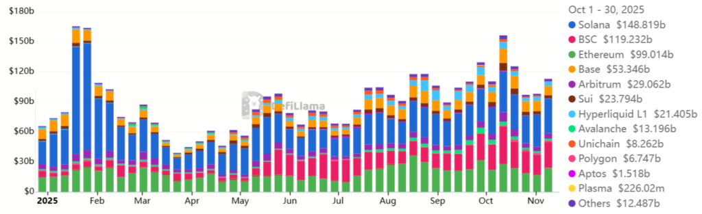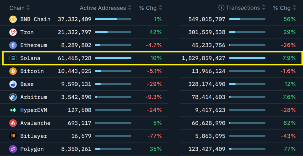 در ۳۰ روز گذشته، فعالیت کاربران شبکه سولانا جهشی چشمگیر داشته است. تعداد آدرسهای فعال ۱۰٪ افزایش یافته و تراکنشها نیز ۸٪ رشد کردهاند. این در حالی است که در همین بازه، تعداد آدرسهای فعال در اتریوم ۵٪ کاهش یافته و حجم تراکنشهای آن ۲۶٪ افت کرده است. حتی در اکوسیستم صرافیهای غیرمتمرکز، پلتفرم هایپرلیکویید (Hyperliquid) که رقیب جدیدی برای سولانا محسوب میشود، کاهش ۲۸٪ در فعالیت درونزنجیرهای خود تجربه کرده است.