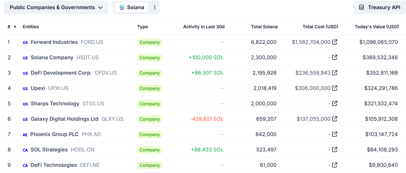 فروش ۴۳۹,۶۲۱ واحد SOL توسط شرکت گلکسی دیجیتال (Galaxy Digital Holdings) نگرانیهایی درباره پایداری ذخایر شرکتی سولانا ایجاد کرده است. در مقابل، شرکت فوروارد اینداستریز (Forward Industries) با دارایی ۶.۸۲ میلیون واحد SOL، همچنان بزرگترین دارنده شرکتی این توکن محسوب میشود و این میزان در ۳۰ روز گذشته ثابت باقی مانده است.