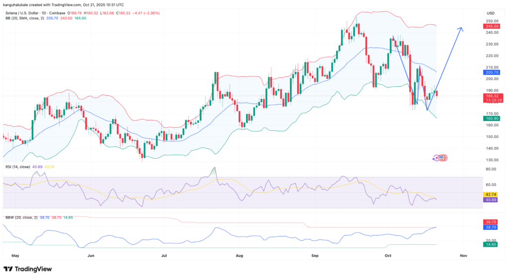 به گفته جان بولینگر، نوسانات اخیر سولانا که دوبار در محدوده ۱۷۵ دلاری حمایت شده، نشانهی از احتمال بازگشت بازار است. اندیکاتور باندهای بولینگر او نیز بر پایه انحراف معیار حول میانگین متحرک ساده عمل میکند و برای تعیین محدودههای نوسانی و شناسایی سطوح اشباع خرید یا فروش به کار میرود.