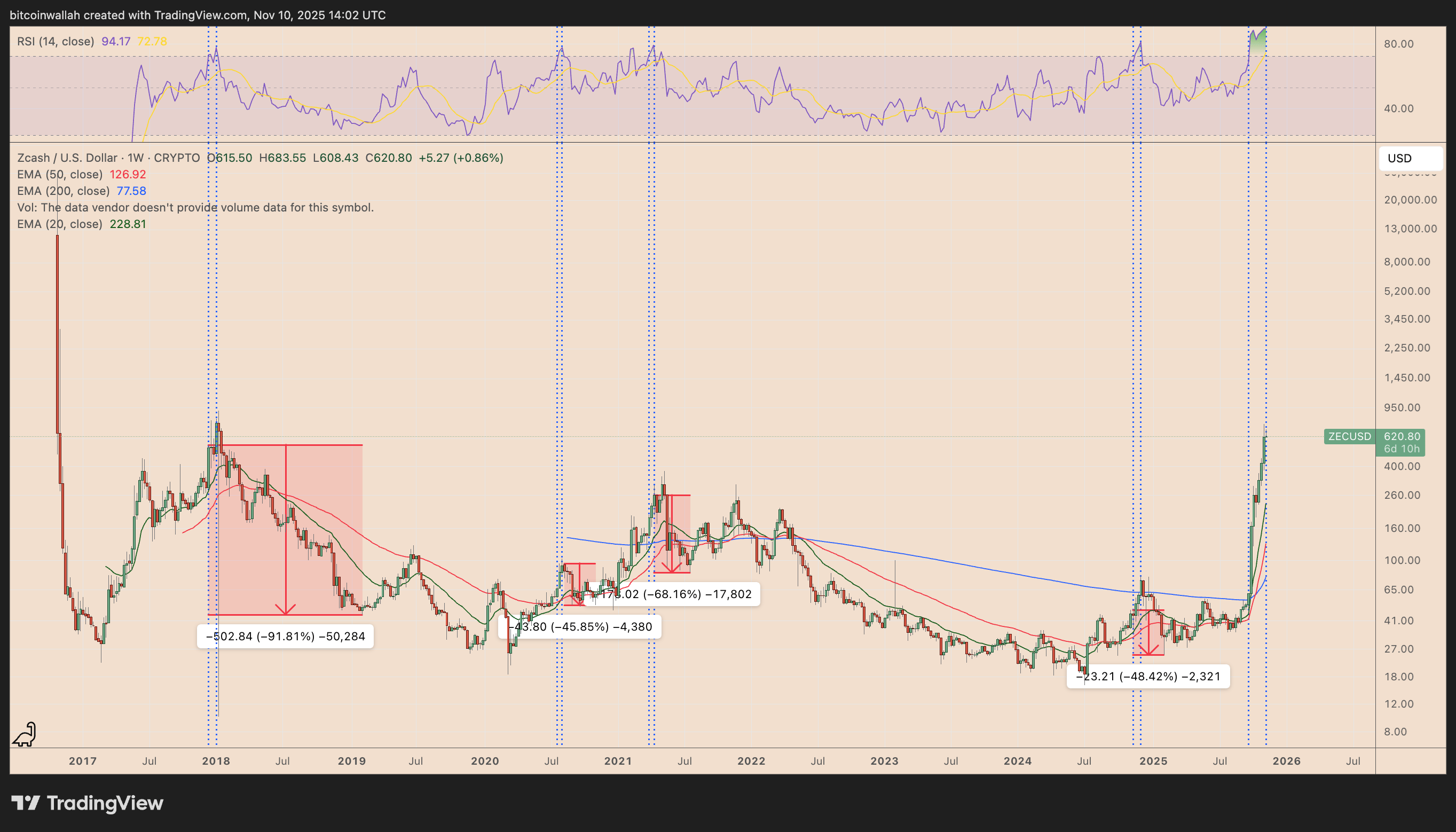 شاخص قدرت نسبی (یا RSI) در تایم‌فریم هفتگی زی‌کش این هفته به عدد ۹۴.۲۴ رسیده که بالاترین سطح ثبت‌شده در تاریخ این رمزارز است. در گذشته، هر بار که RSI ز‌ی‌کش وارد محدوده‌ اشباع خرید شده، قیمت معمولاً برای چند هفته دیگر به رشد ادامه داده و سپس با اصلاح‌هایی شدید و چندماهه مواجه شده است که در برخی موارد تا ۹۰٪ کاهش را رقم زده‌اند.