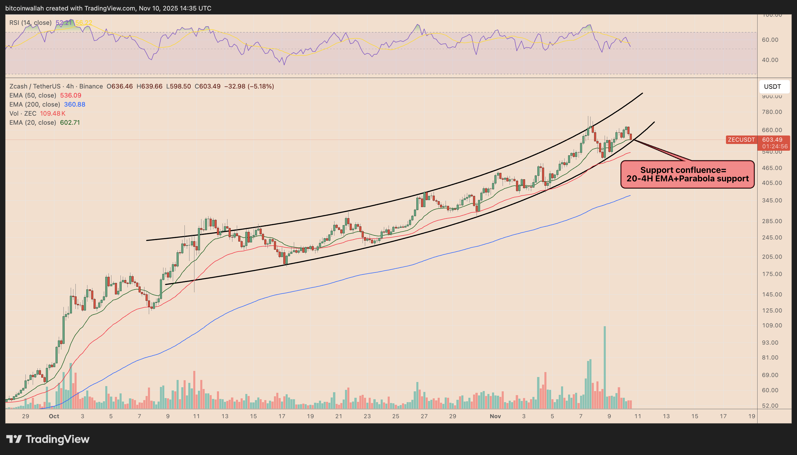 با این حال، در نمودار چهارساعته، زی‌کش هنوز درون یک کانال صعودی پارابولیک حرکت می‌کند و اکنون در حال آزمایش ناحیه‌ حمایتی مهمی است که از تلاقی میانگین متحرک ۲۰ روزه و کف این کانال شکل گرفته است. اگر قیمت بتواند از این محدوده جهش کند، احتمال ازسرگیری روند صعودی و حرکت به‌سوی سقف کانال در بازه‌ ۹۰۰ تا ۱,۰۰۰ دلار وجود دارد؛ این سطح با پیش‌بینی خوش‌بینانه‌ آرتور هیز نیز هم‌راستا است.