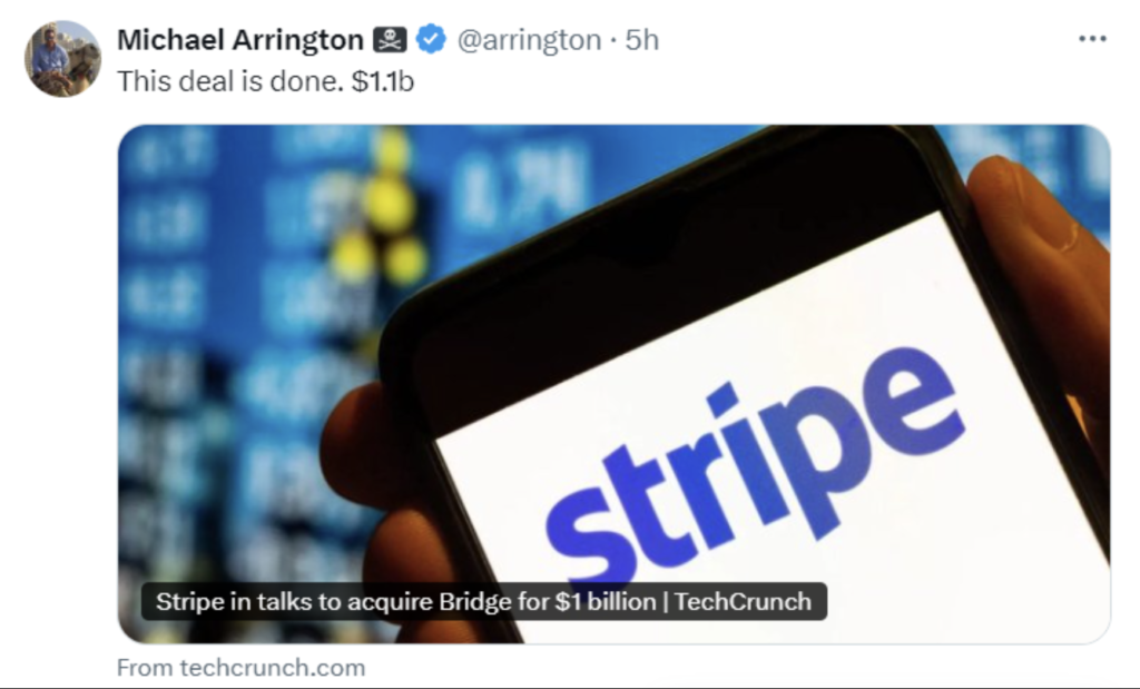 شرکت فناوری مالی استرایپ (Stripe)، پلتفرم استیبل کوین بریج (Bridge) را به قیمت ۱.۱ میلیارد دلار خریداری کرده است. این خبر توسط مایکل آرینگتون (Michael Arrington)، بنیانگذار رسانه تککرانچ (TechCrunch)، اعلام شده است.