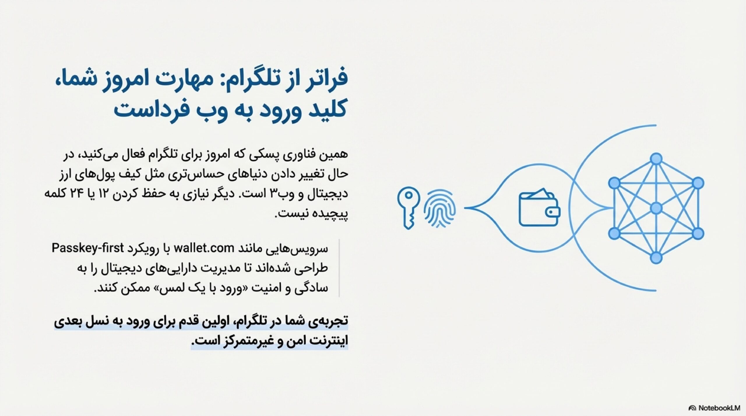 برای شمایی که در دنیای ارزهای دیجیتال فعالیت میکنید و پسکی تلگرام را فعال کردید، استفاده از یک کیف پول با رویکرد Passkey-first قدمی طبیعی و جذاب خواهد بود. تجربه کاربری تقریبا همان است، فقط این بار به جای پیامهای چت، ورود به دنیای داراییهای غیرمتمرکز را با همان اثر انگشت یا چهره مدیریت میکند، که در نوع خود و البته به شرطی که حواستان باشد پسکی را پاک نکنید، تجربهای بسیار روان و دلنشین برایتان رقم خواهد زد.