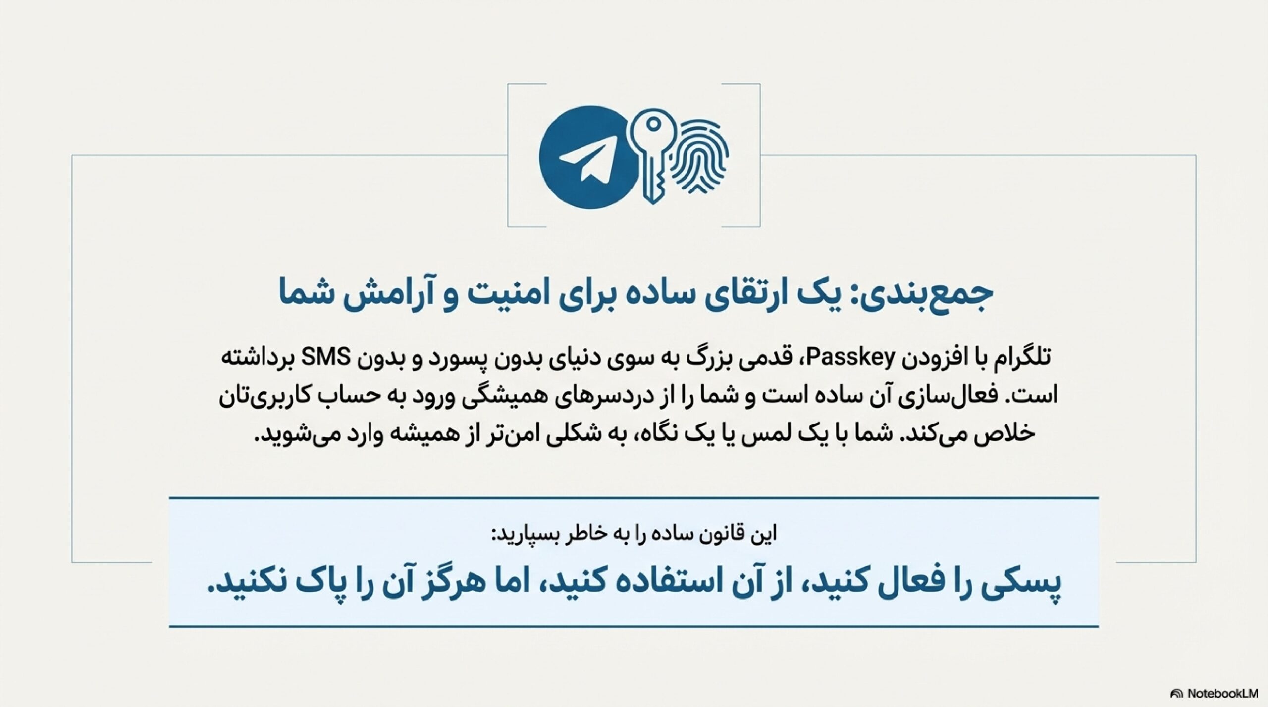 اگر iOS شما به روز است و پیشنیازها را دارید، فعال کردن پسکی تلگرام نه پیچیده است و نه وقتگیر، اما میتواند حساب شما را از بسیاری از دردسرهای رایج دور نگه دارد. کافی است هنگام کار با مدیریت پسوردها حواستان جمع باشد، برای پسکی تلگرام راه جایگزین منطقی در دستگاه دیگر داشته باشید و مهمتر از همه، این قانون ساده را فراموش نکنید:
