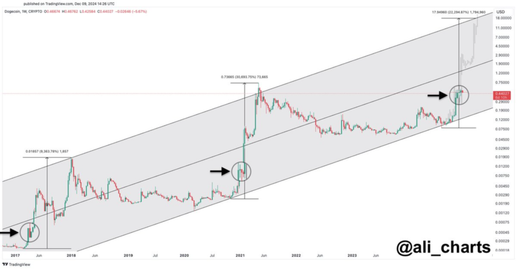 اظهارات تحلیلگران بازار کریپتو نشان میدهد بسیاری از آنها نسبت به DOGE بسیار خوشبین هستند و معتقدند قیمت آن همچنان پتانسیل رشد بیشتر را دارد. علی مارتینز (Ali Martinez)، تحلیلگر مشهور بازار، معتقد است دوج کوین همچنان در جایگاه خوبی در چرخه صعودی خود قرار دارد. او به کانال رگرسیون در نمودار هفتگی این دارایی اشاره کرد.