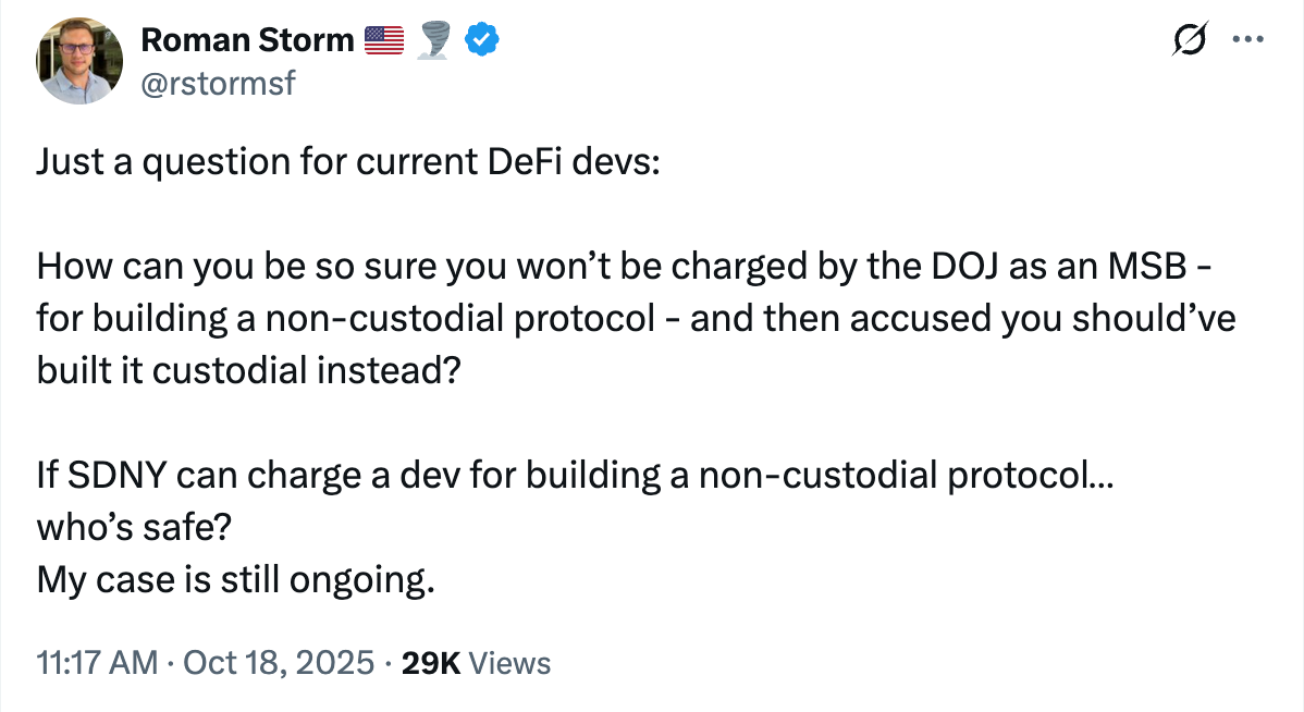 استورم در پیامی در شبکه اجتماعی X تأکید کرد که وزارت دادگستری آمریکا (DOJ) میتواند از این منطق استفاده کند که «هر سرویس غیرمتمرکز باید بهصورت حضانتی ساخته شود» و از همین منظر، توسعهدهندگان را بهعنوان «کسبوکار انتقال پول بدون مجوز» متهم کند.