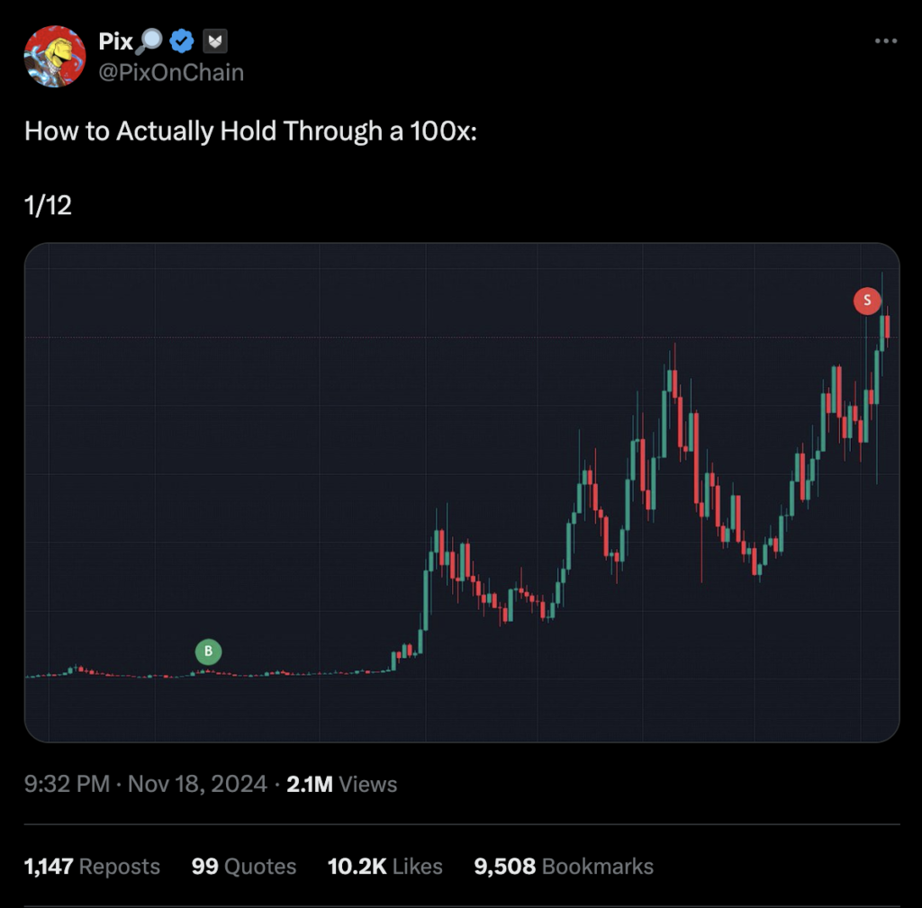 این معاملهگر با نام کاربری Pix در شبکه اجتماعی X بیش از ۵۲ هزار دنبالکننده دارد. او در یکی از پستهای اخیر خود، دیدگاههایش را درباره دستیابی به سودهای ۱۰۰ برابری و تغییر پورتفلیوی رمزارزی با استفاده از استراتژیهای صحیح به اشتراک گذاشته است. علاوه بر این، او توضیح داده که چگونه میتوان در طول این فرایند سوددهی به موفقیت ادامه داد.