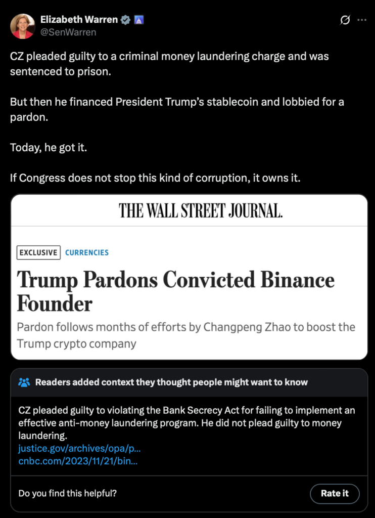 وارن در تاریخ ۲۳ اکتبر در شبکه اجتماعی ایکس (X) پستی منتشر کرد و در آن مدعی شد ژائو به جرم پول شویی مجرمانه اعتراف کرده و در ازای دریافت عفو از ترامپ، به او رشوه داده است. تیم حقوقی ژائو تأکید دارد که این ادعاها نهتنها نادرست هستند، بلکه به اعتبار موکلشان لطمه جدی وارد کردهاند.