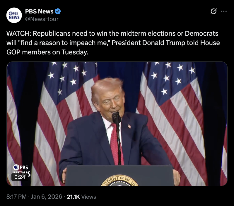 دونالد ترامپ روز سهشنبه در سخنرانی خود خطاب به جمهوریخواهان مجلس نمایندگان تأکید کرد که در صورت واگذاری کنترل کنگره به دموکراتها، استیضاح او تقریباً قطعی خواهد بود. او گفت اگر جمهوریخواهان نتوانند در انتخابات میاندورهای پیروز شوند، دموکراتها «دلیلی پیدا خواهند کرد» تا روند استیضاح را دوباره به جریان بیندازند.