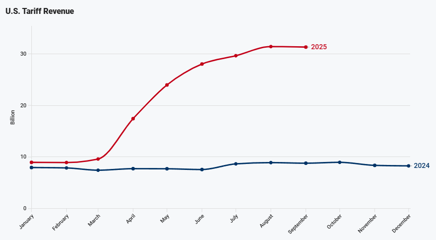 بر اساس آماری که توسط وزارت خزانه‌داری و رسانه‌های تایید شده، دولت آمریکا تاکنون از محل تعرفه‌ها در سال ۲۰۲۵ حدود ۲۱۴ میلیارد دلار کسب کرده است.