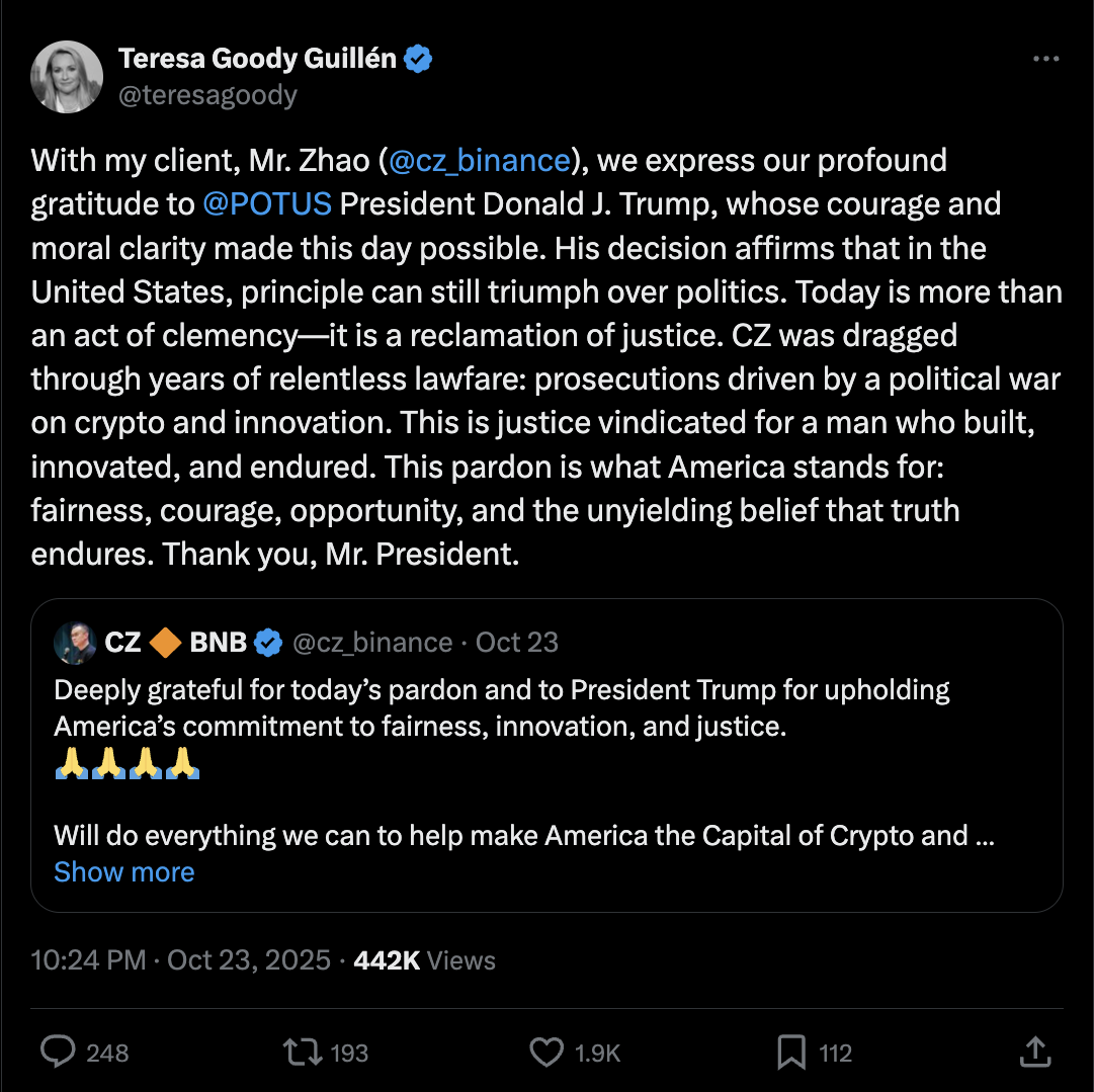 توییت وکیل ارشد CZ درباره عفو او - منبع: Teresa Goody Guillén