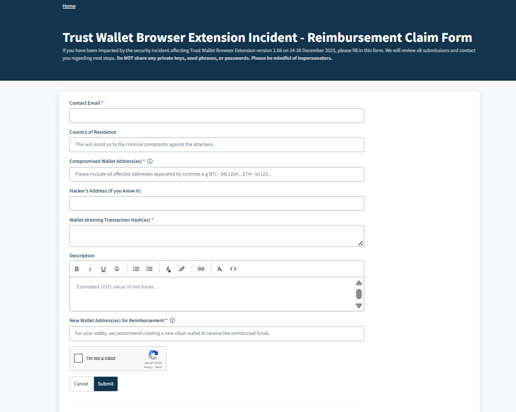 به گزارش میهن بلاکچین، پس از این حادثه، تراست ولت اعلام کرد کاربران قربانی میتوانند درخواست جبران خسارت خود را از طریق پورتال رسمی پشتیبانی ثبت کنند. برای بررسی هر پرونده، کاربران باید اطلاعاتی از جمله آدرس کیف پول، آدرس دریافتکننده مهاجم، هش تراکنش و کشور محل سکونت خود را ارائه دهند.